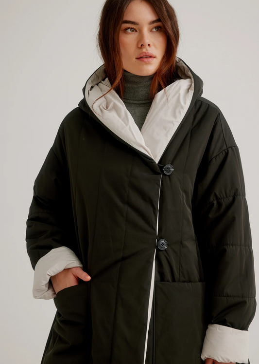 Reversible Faux Fur Coat W/ Fixed Hood & Button Front