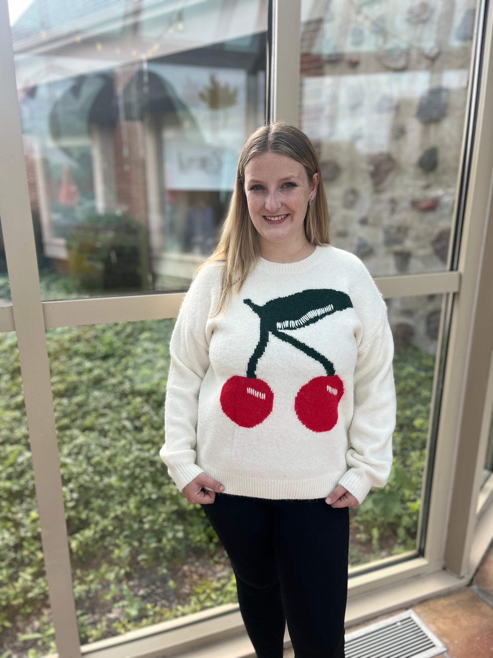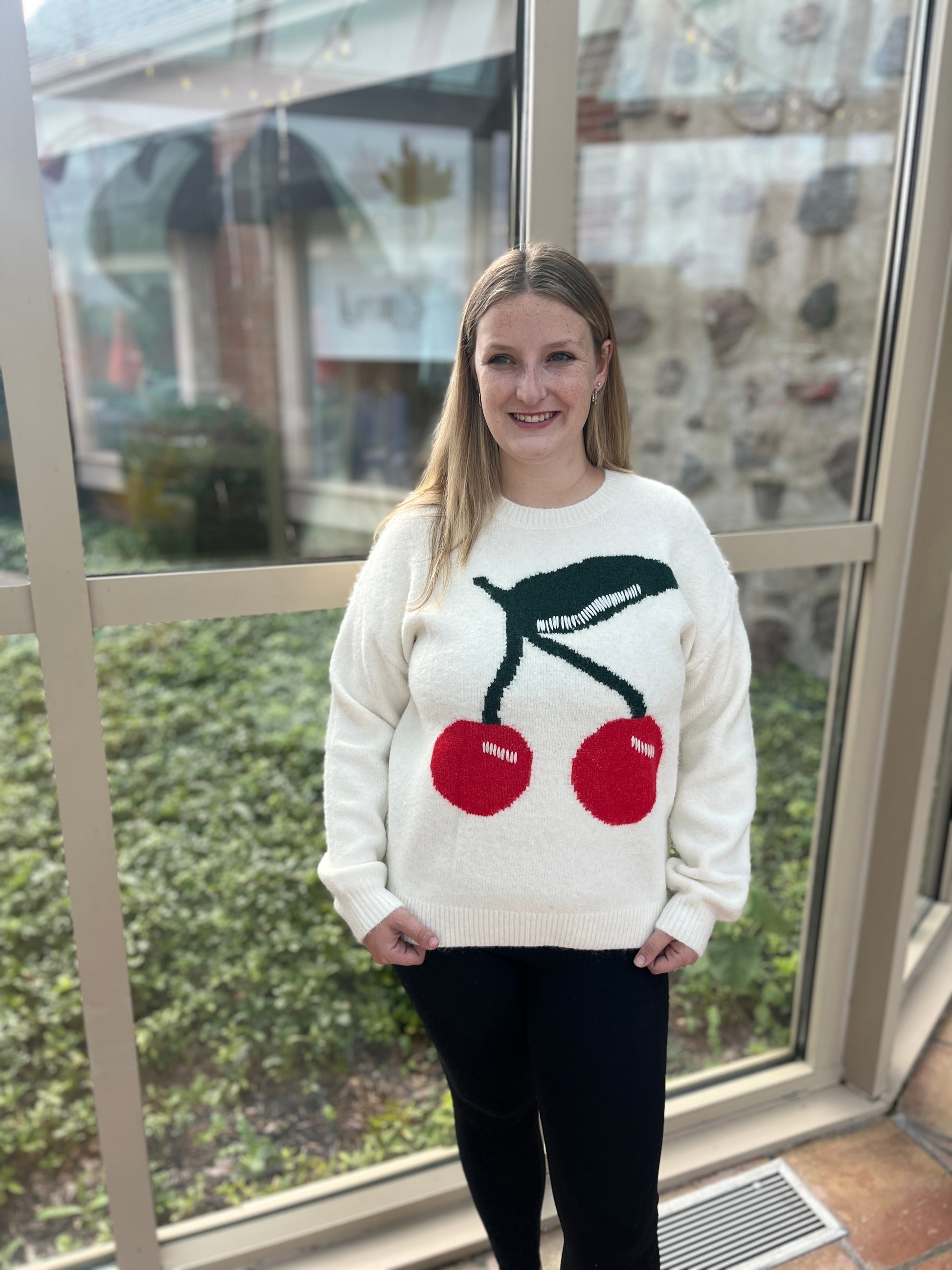 Sweet, bold, and cozy — this cherry sweater adds a playful pop to your wardrobe. Crafted with a soft, plush knit and an oversized cherry graphic, it’s the perfect blend of fun and comfort. Pair it with jeans for a casual day out or dress it up with a skirt and boots for a chic seasonal look.