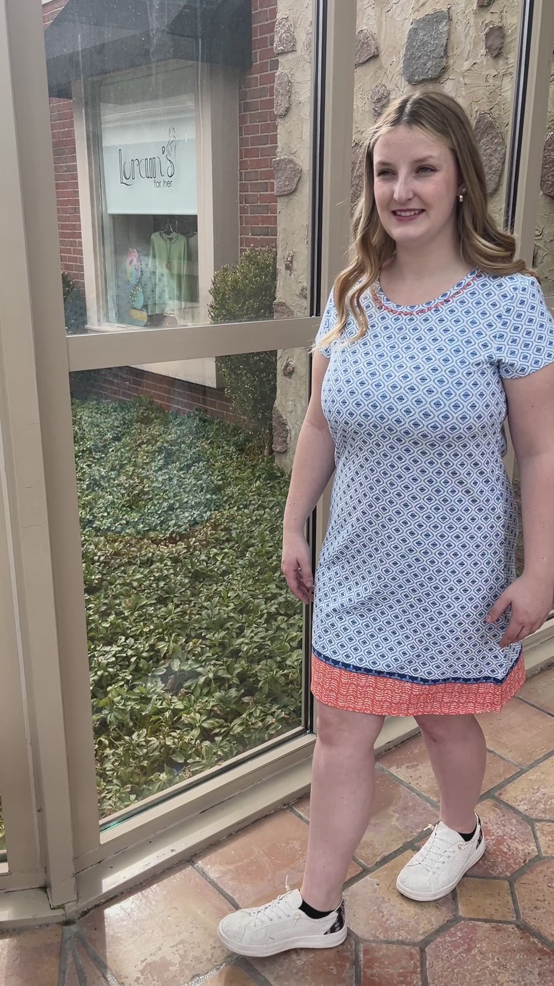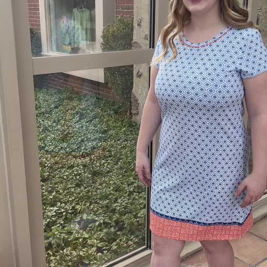 Coastal-inspired elegance meets everyday comfort. Our Cici A-Line Dress showcases a refreshing blue geometric pattern complemented by a vibrant coral border—creating visual interest that flatters any figure.