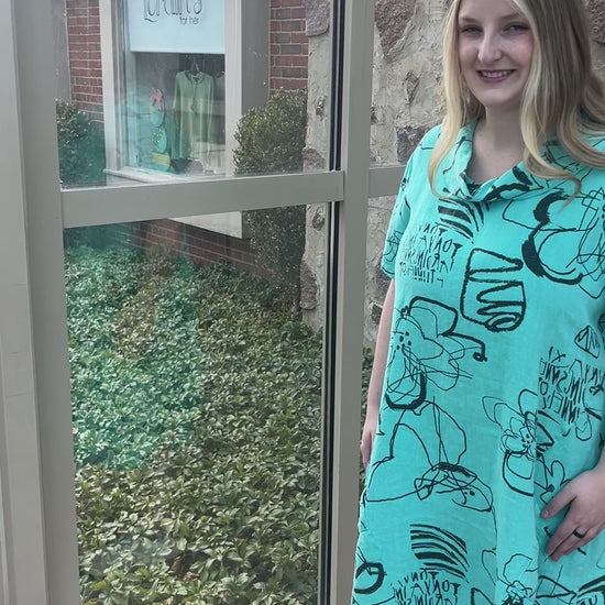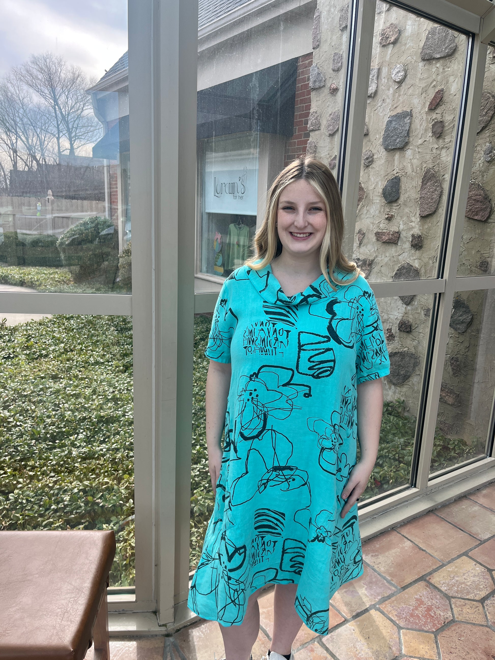 Make a stunning artistic statement with our Fenini Art Dress in vibrant turquoise. This eye-catching piece showcases an abstract, sketch-like design with freeform black line art that transforms a casual silhouette into wearable art.