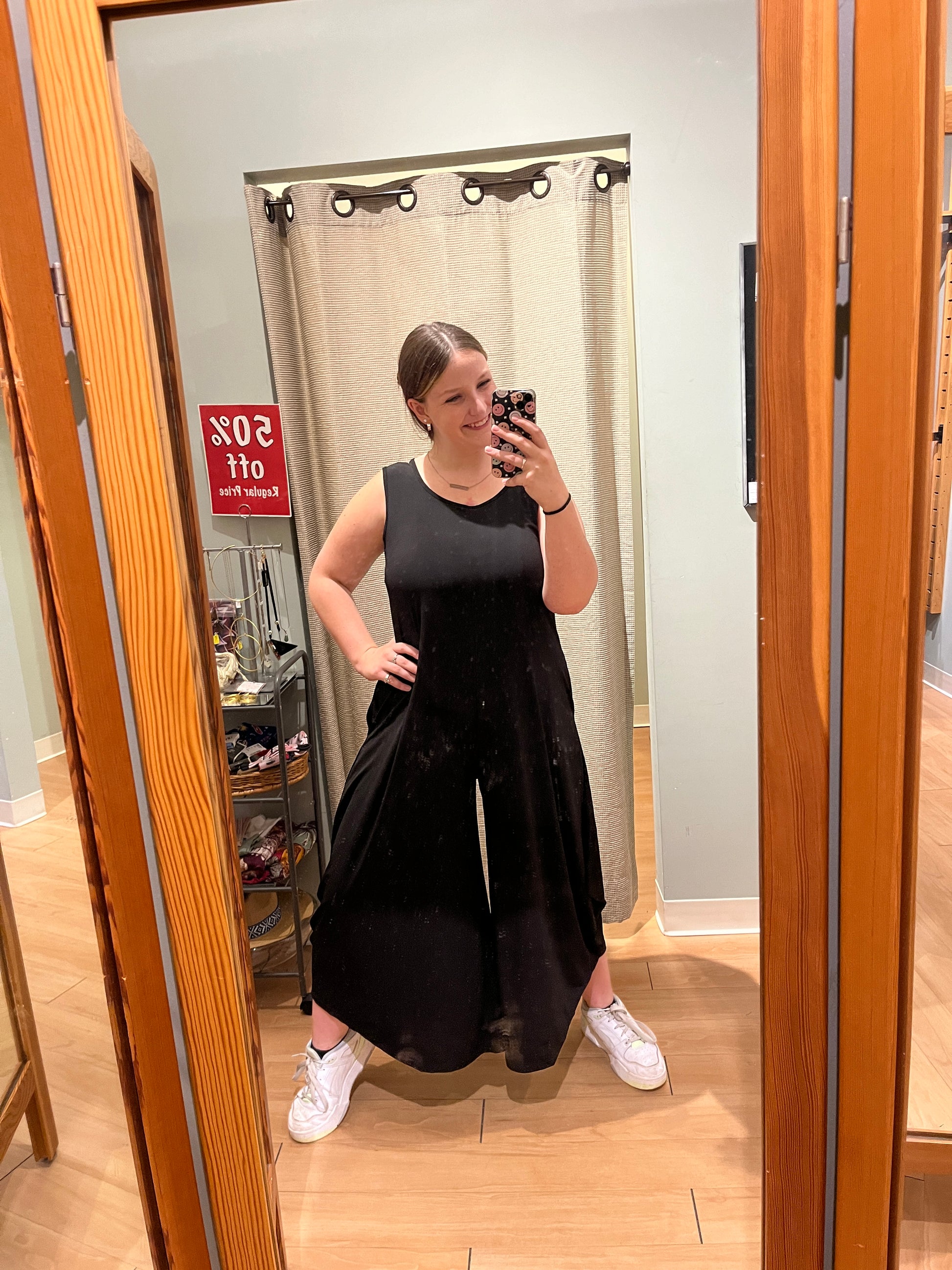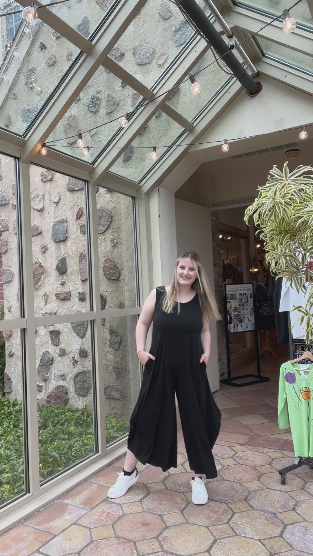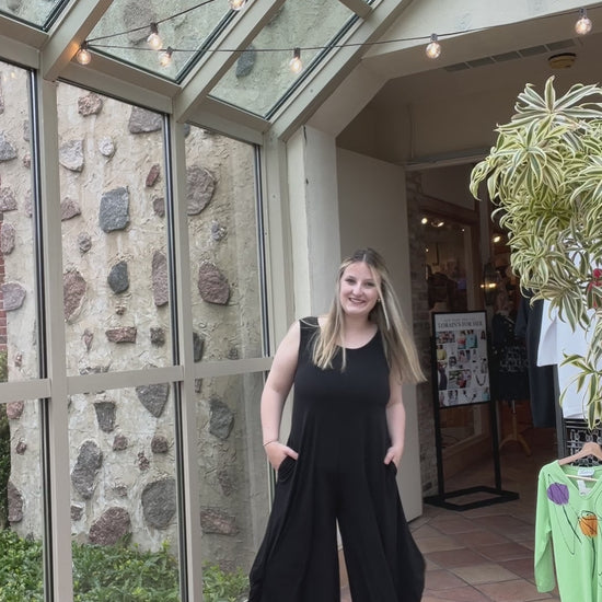 Effortlessly chic and endlessly versatile, this sleeveless jumpsuit is a must-have layering piece that can be dressed up or down with ease. Designed with a relaxed fit and wide, angular draped legs, it offers both comfort and modern style. Thoughtful details include a round neckline, vertical seams at the front and back, and practical side seam pockets. The full-body silhouette slips on easily—no zippers required.