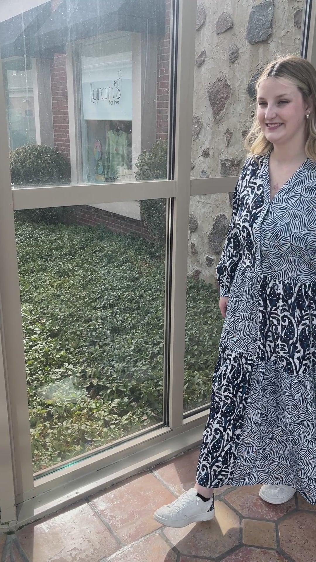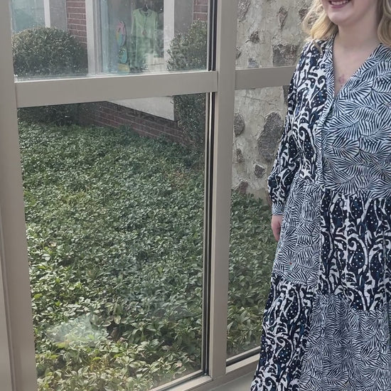 Make a striking statement with our Lia Cotton Tiered Dress, an exquisite blend of contemporary design and timeless comfort. This eye-catching dress features a captivating contrast of navy and white patterns – one side showcasing an elegant abstract floral motif and the other displaying a modern geometric line pattern that beautifully complement each other in perfect harmony.