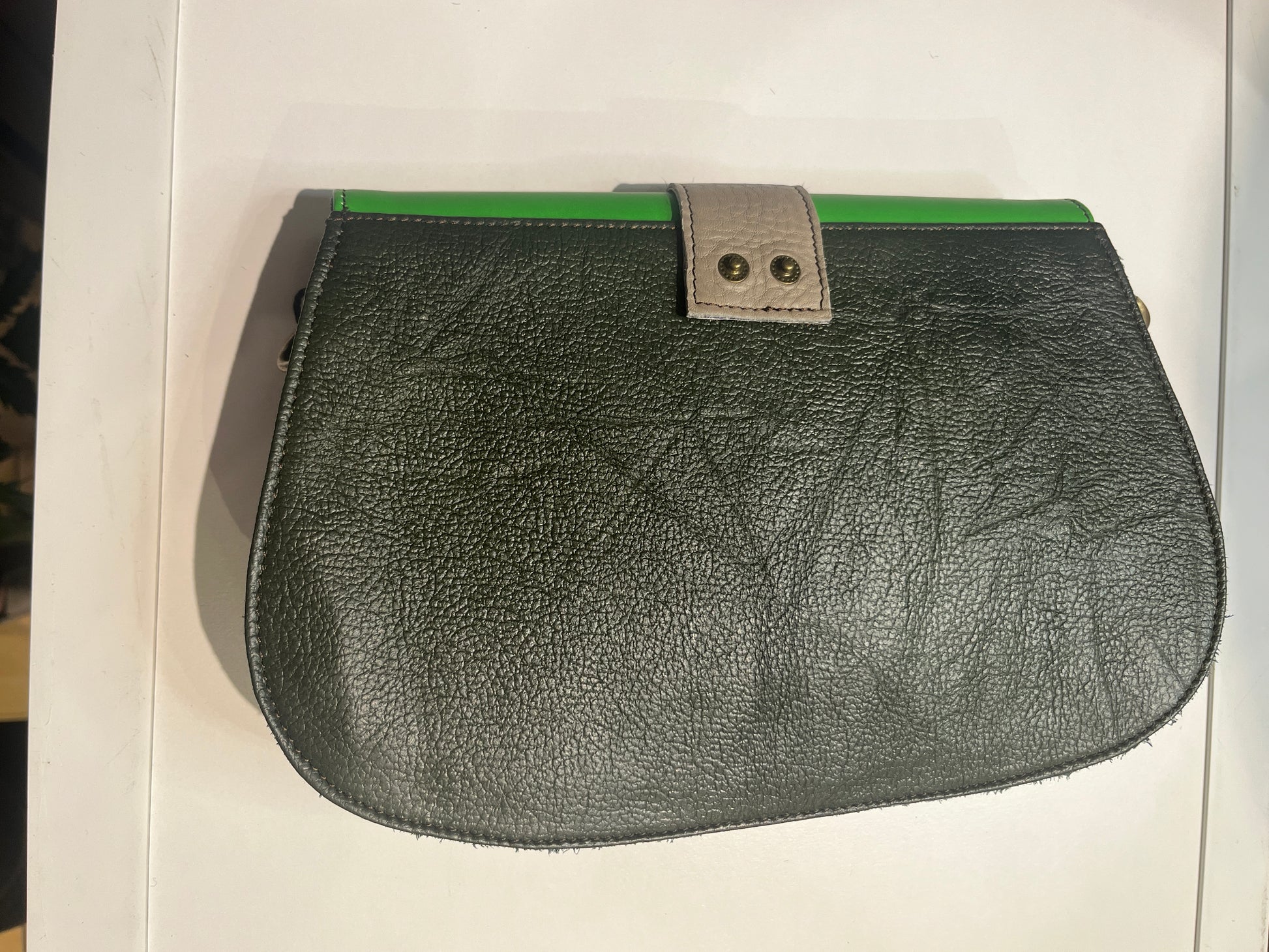 Make a bold, eco-friendly statement with this standout Soruka crossbody bag. Handcrafted from recycled leather, every Soruka piece is completely unique—designed from leftover leather scraps that would otherwise go to waste. This style features a striking mix of bright lime green, deep emerald, and a metallic green front pocket, finished with a textured hair-on detail at the closure.