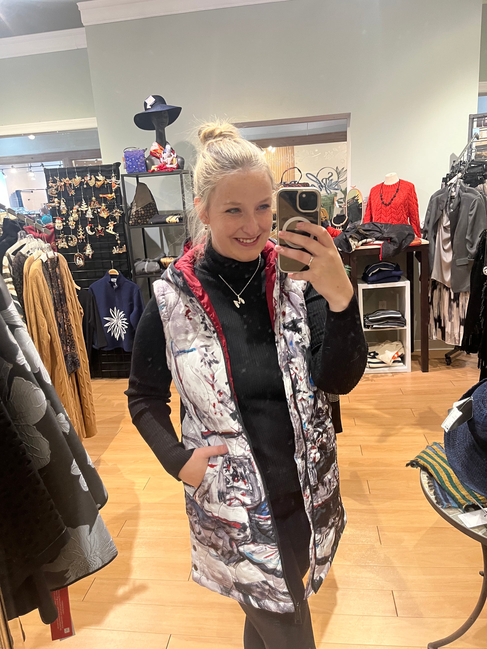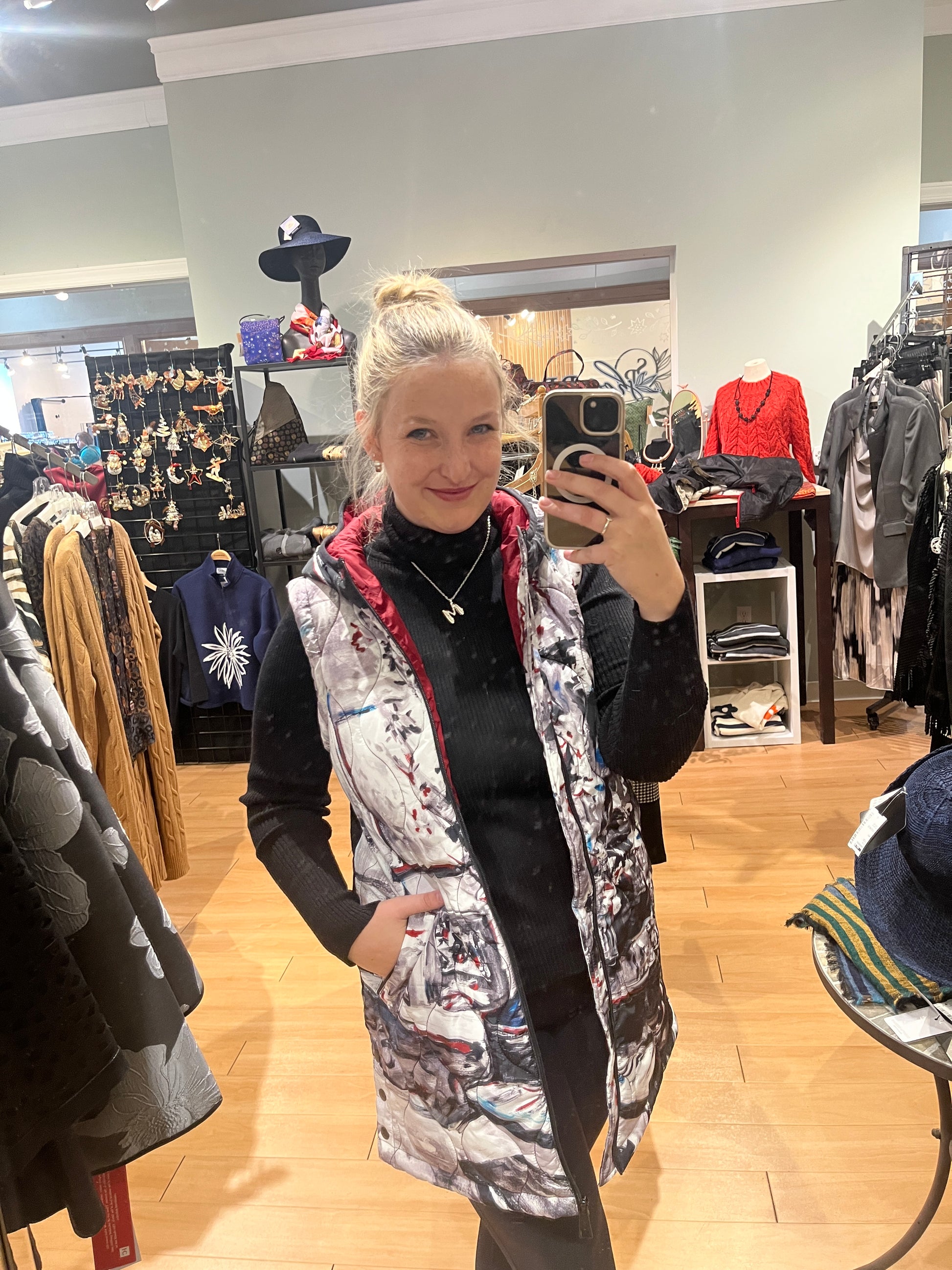 Stay warm and stylish this Fall with our Piano Blues Long Hoodie Vest! Made with a smooth, quilted material in trendy Fall and Winter colours, it features a longer length, hood, two front pockets, side hem buttons, and a unique artistic design. Keep cozy and in fashion with this one of a kind vest.