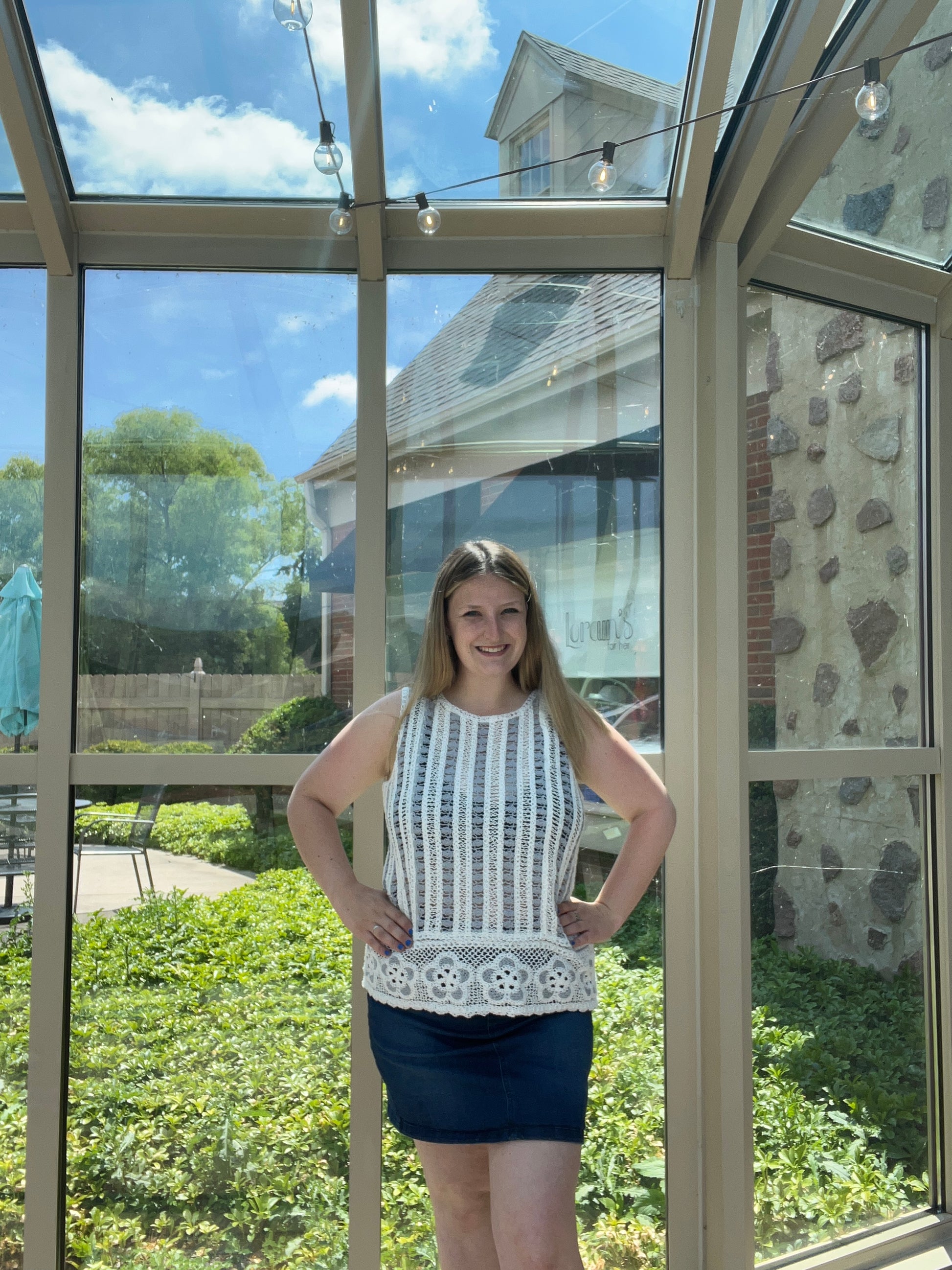 Embrace spring style with our Bluebell Crochet Top featuring an intricate floral border and blue and white striped pattern. Made from 100% breathable cotton, this sleeveless piece offers breezy comfort with bohemian charm.